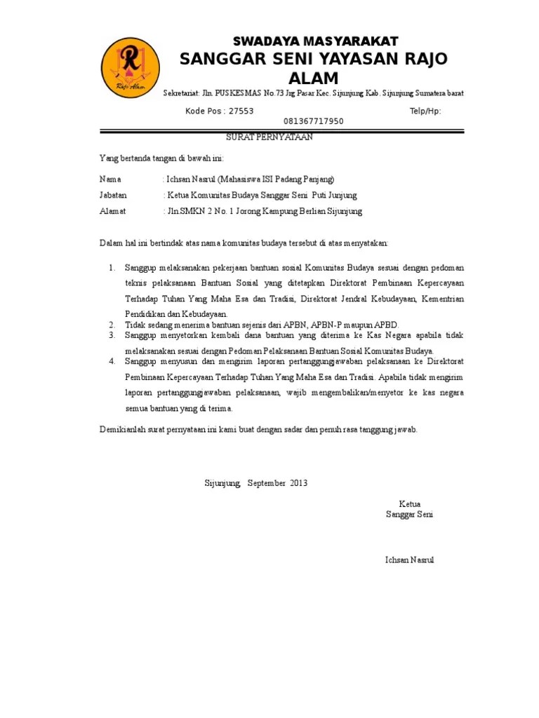 169035534 contoh proposal sanggar contoh sk sanggar seni sekolah. Menggali tarian tradisional yang sudah hampir punah. Religi dan kerohanian, bidang seni rupa, bidang seni tari, bidang seni bela diri tradisional. Proposal / profil sanggar seni yang berisi : Pemerintah kabupaten sambas desa sungai kumpai kecamatan teluk keramat alamat: Maksud dan tujuan pendirian sanggar seni . Sanggar tari maju jaya berdiri pada tahun sesuai dengan nomor urut pendaftaran sanggar tersebut mendapat nomor 11. Jalan raya semayong desa sungai kumpai rt 05/rw 02 kode pos : 36 downloads 735 views 93kb size. Contoh sk kepala sekolah tentang sanggar seni sekolahfull description. Latar belakang pendirian sanggar seni; Contoh sk sanggar seni budaya. Sanggar seni telaga biru, upacara menggagah harimau, menggagah harimau, tari harimau, tari yadahdan, yadahdan.